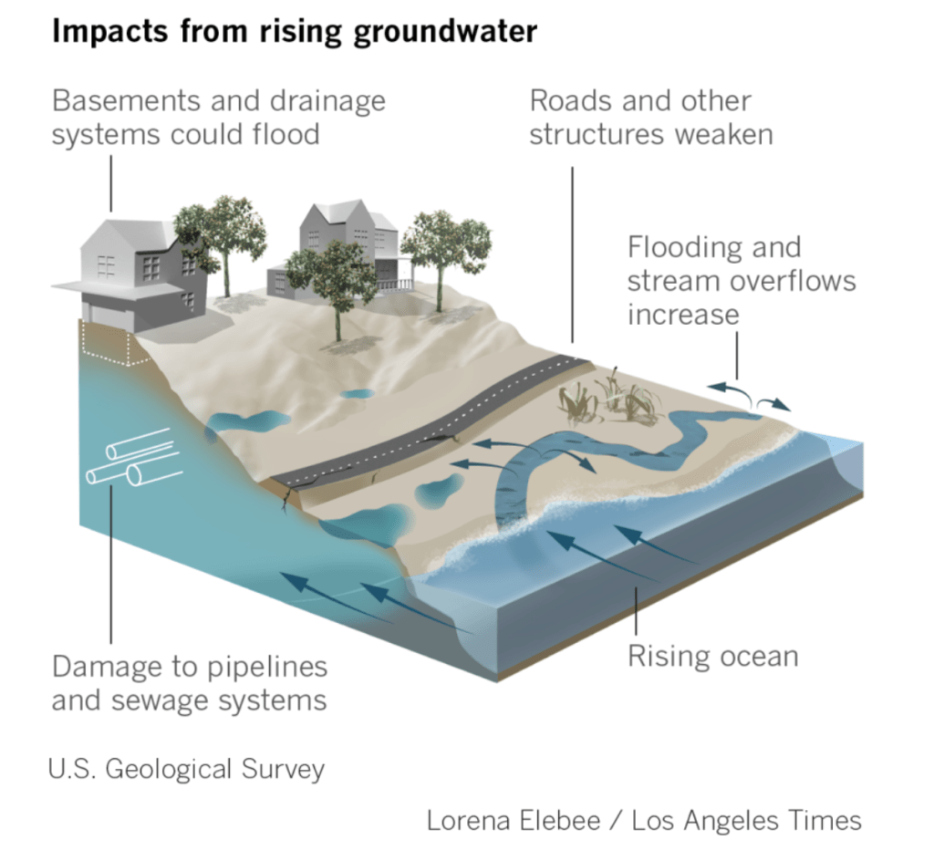 LA Times article about how the interactions of sea level rise with ground water will cause flooding in areas away from the ocean, as well as increase salt water intrusion.