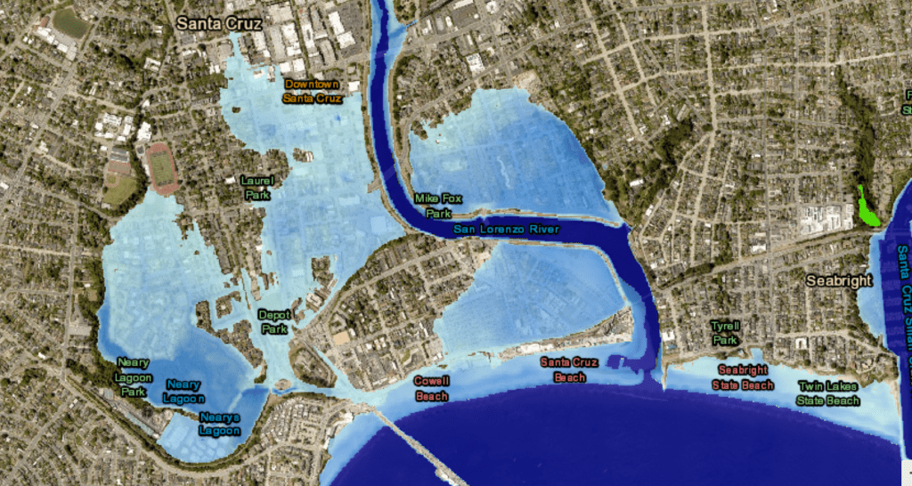 As sea-levels rise, the city of Santa Cruz will also experience an increased incidence of severe flooding near the riverbank including downtown and the beach flats neighborhood.
